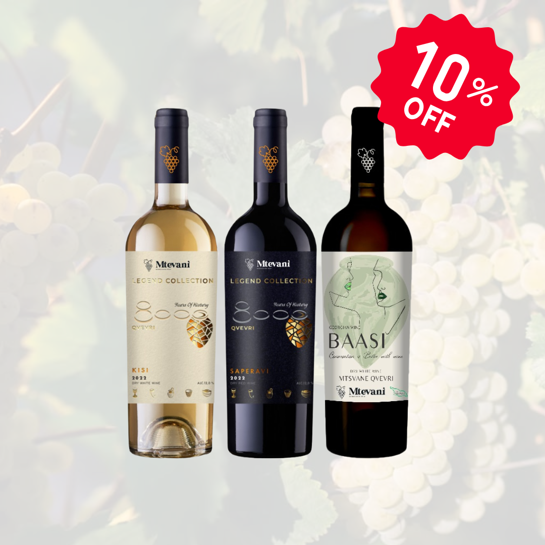 Entdecken Sie die Vielfalt der georgischen Qvevri-Weinkunst in einem exklusiven Set. Das Paket umfasst drei trockene Spitzenweine, die in traditionellen Tonamphoren (Qvevri) ausgebaut wurden: